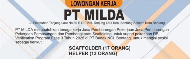 Pengumuman rekrutmen ini secara resmi ditandatangani oleh Kepala Dinas Ketenagakerjaan Kota Bontang, Abdu Safa Muha, serta pihak personalia PT Milda, Firmansyah.