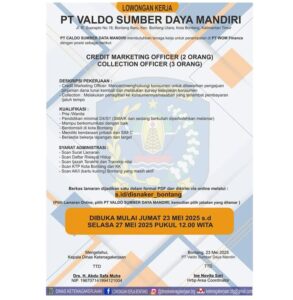 Iknnews.co, Bontang – PT Valdo Sumber Daya Mandiri membuka lowongan kerja untuk dua posisi, yakni Credit Marketing Officer (2 orang) dan Collection Officer (3 orang), dengan penempatan di PT Wom Finance Bontang.